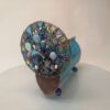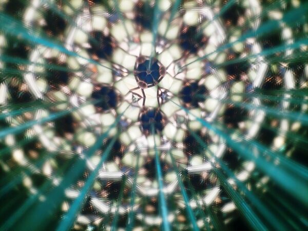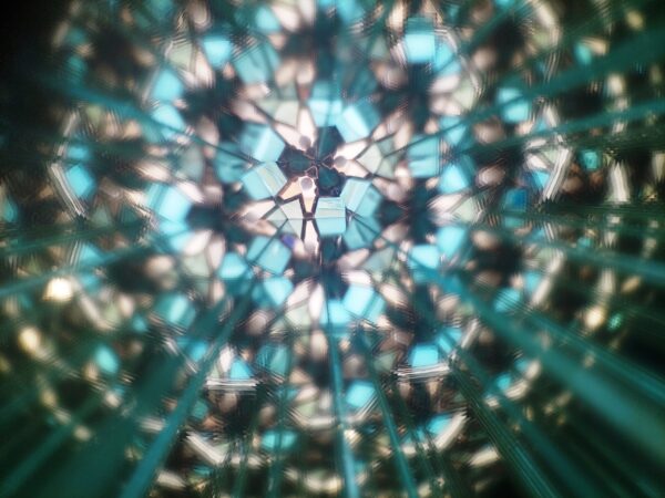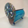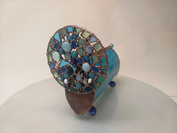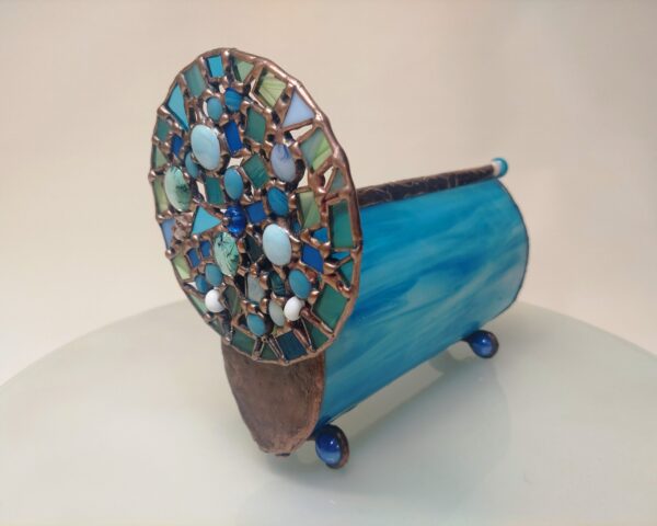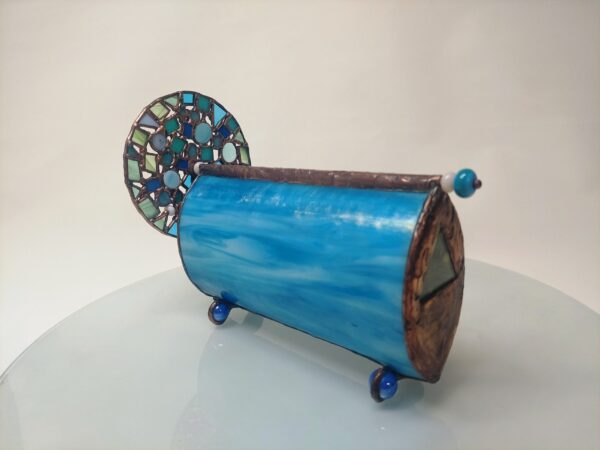Az Azúr bűvölet kaleidoszkóp testét irizáló türkizkék üvegből hajlítottuk, amely a fényt minden irányból másként töri meg. A felület játékosan reagál a környezetre, hol zöldes árnyalatokat, hol tengerkék ragyogást idéz. Belsejében három, precízen illesztett tükör alkotja a képet, amely a kék számtalan tónusában születik újjá minden elfordításnál. A belső világ folyton változik – minden mozdulat új mintát, új élményt teremt.